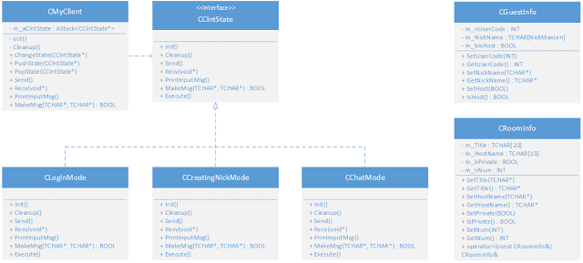 클라이언트는 로그인, 닉네임 생성, 채팅 3가지 모드에 맞춰 실행되는데 이는 각각의 상태에 대응되는 객체들의 실행으로 이루어진다. 이때 이 대응되는 각각의 객체들을 가리키기 위해 CClntState* 타입의 포인터 변수를 사용하는데, 이들을 데이터 타입으로 배열 구조 형식의 스택으로 만들어 상태 전이를 보다 용이하게 하기 위한 목적으로 사용한다.