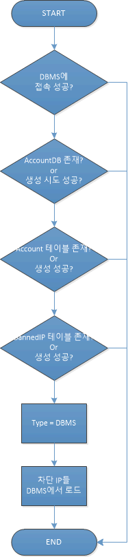 Main Server가 구동을 시작 할 때 DBMS에 접속을 성공한 경우, 데이터베이스와 테이블이 DBMS에 존재하지 않는 경우 이들을 새롭게 생성한다.