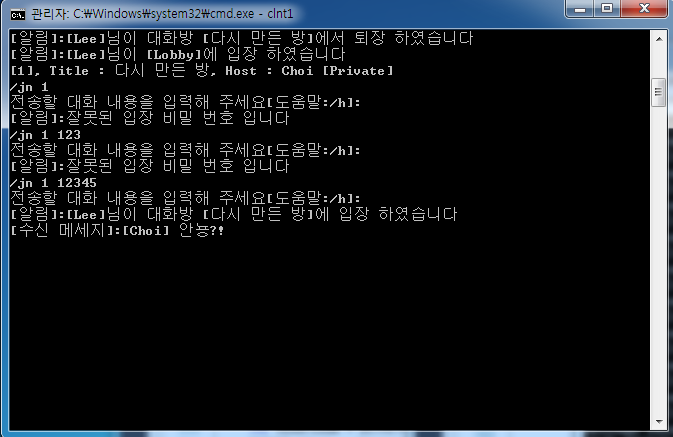 - 명령어 입력시, 대화방 이름 또는 입장 비밀 번호 생략이 가능하다.