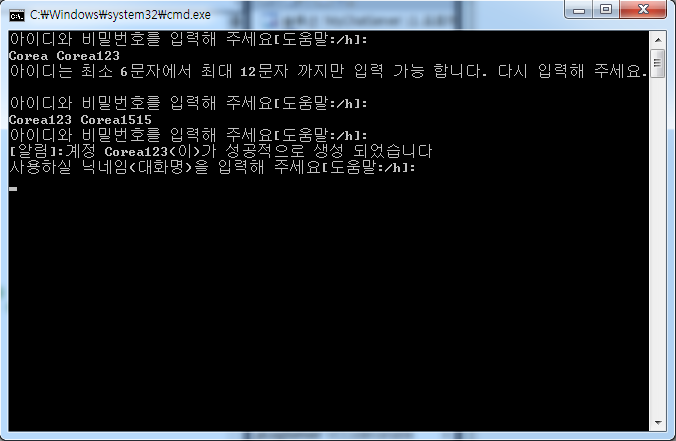 - 서버에 접속하기 위해서는, “계정명”을 입력하고, 스페이스 바 키로 한칸 띄운 뒤에 “계정 비밀번호”를 연속 입력 하고 엔터키를 눌러야 한다.