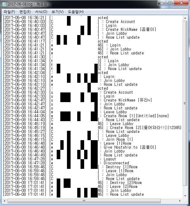 클라이언트의 계정 ID와 IP주소, 기록할 메시지 내용을 인자값으로 받아 “[년도-월-일 시:분:초] [ID:IP] : 내용”과 같은 양식의 메시지를 조합하여 로그 서버로 전송 한다. 만약 로그 서버와 연결되어 있지 않으면 데이터를 전송하지 않고 그대로 반환 한다.