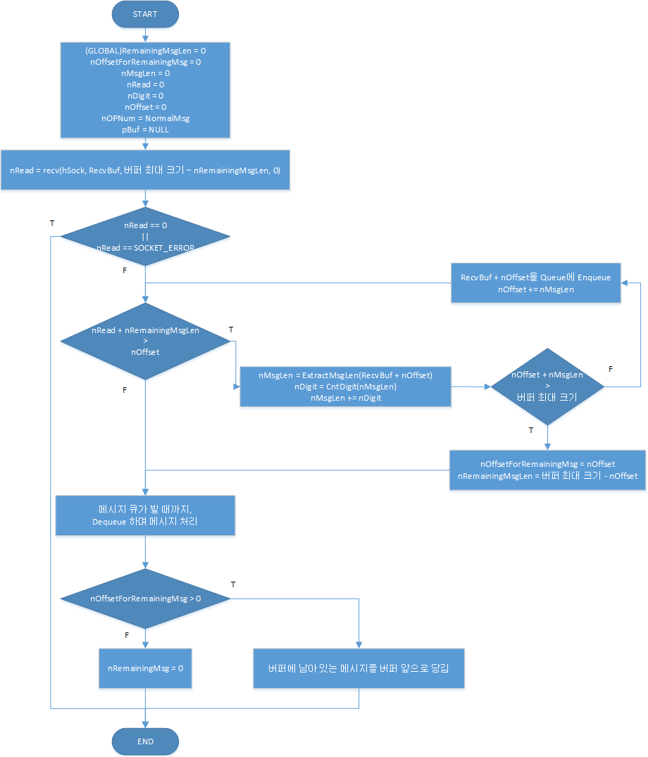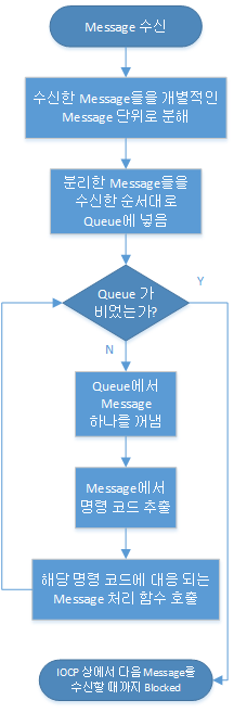 이처럼 간단한 기능만을 수행 하도록 만들어졌기 때문에 Main Server로 부터 IOCP 방식이 아닌 일반적인 동기 모드의 recv 함수 호출을 통해 데이터를 단방향으로 수신 한다.