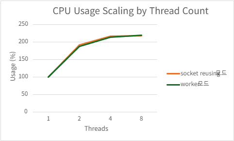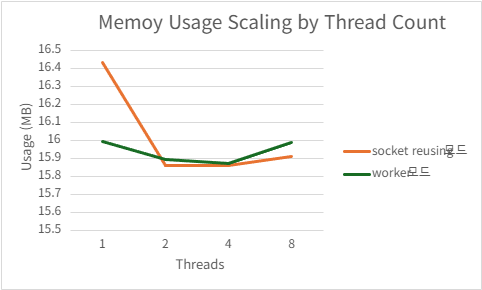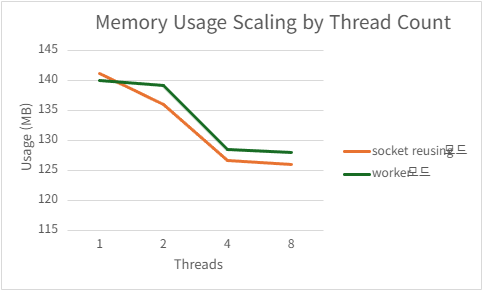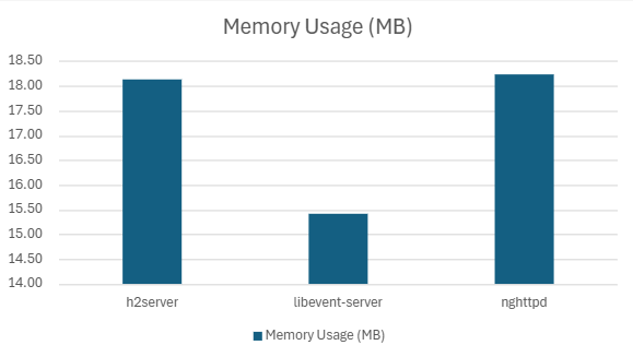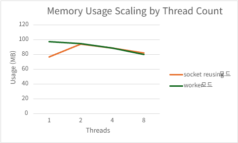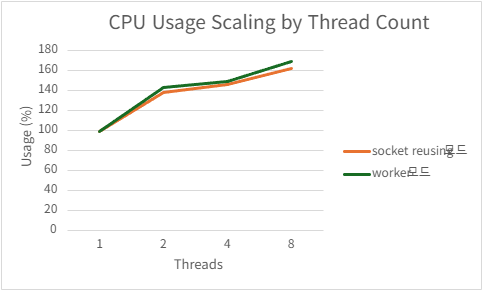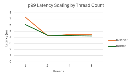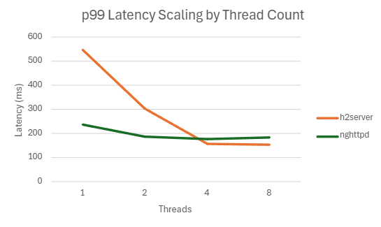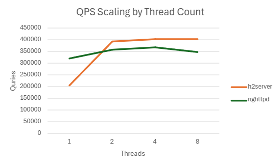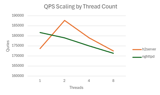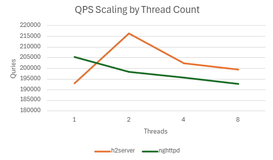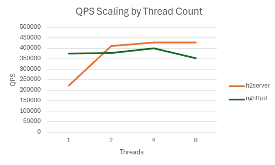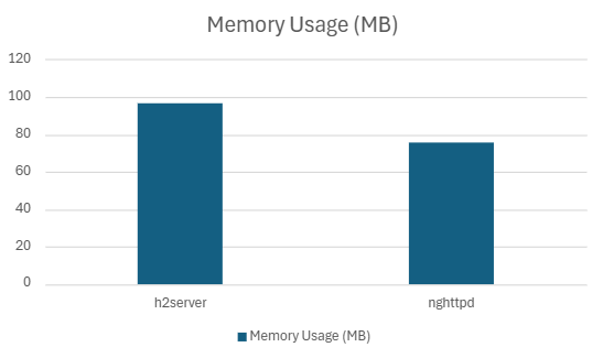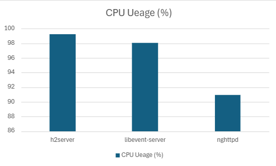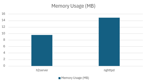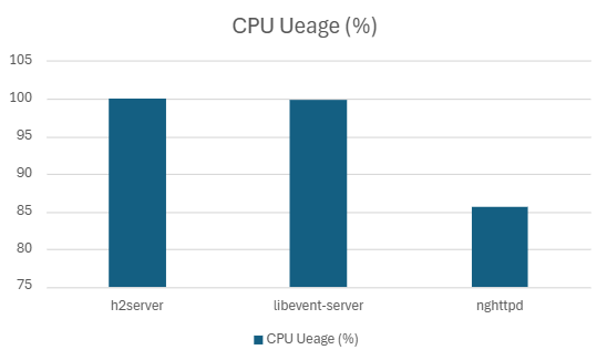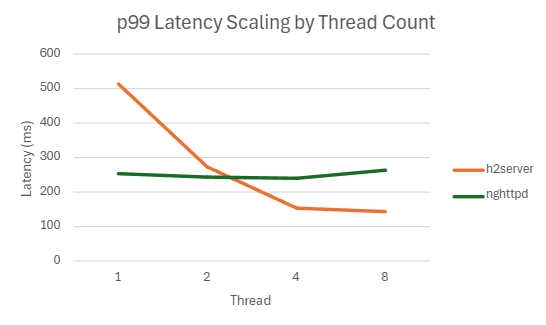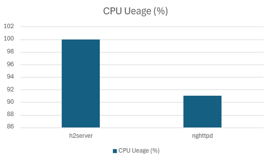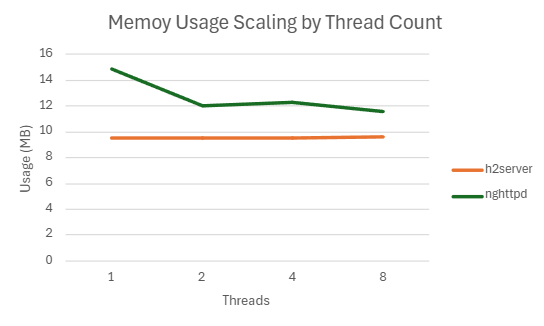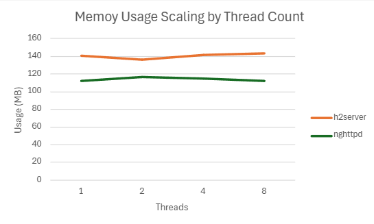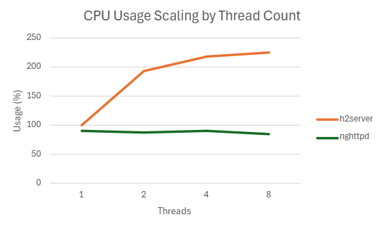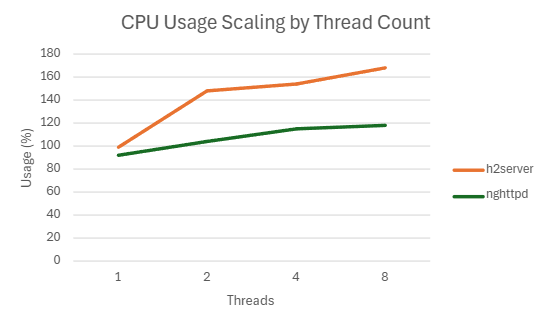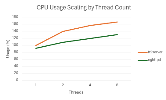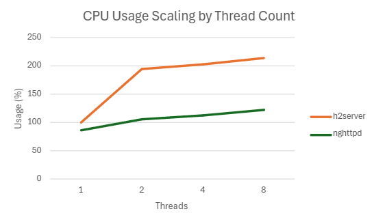 nghttpd는 스레드 증가에 따른 메모리 안정성이 높지만 성능 스케일링 이득은 제한적h2server는 스레드 증가와 함께 CPU/메모리 사용량이 증가하나 처리량도 동반 증가