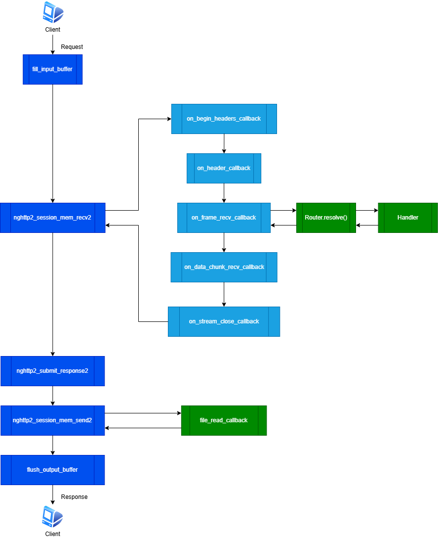 Linux에서 epoll(Edge-Triggered) 로 비동기 통신을 처리하고, nghttp2 + OpenSSL 을 통해 HTTP/2의 요청/응답을 처리한다.
