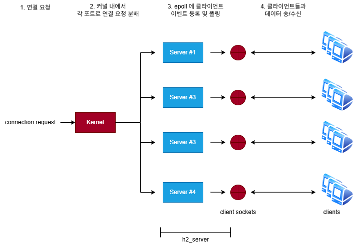 프로그램은 내부적으로 eventfd 기반의 worker 구조로써 acceptor와 worker로 나뉘어져 동작하며