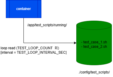 ./config/test_scripts컨테이너 내/app/test_scripts/running경로로 마운트 된다. loop를 돌며 실행 시킬 테스트 스크립트들이 보관 되어있는 경로./config/files컨테이너 내/app/files경로로 마운트 된다.