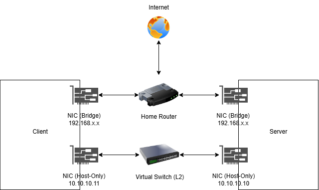 VMware Workstation 에서 Linux(Ubuntu 22.04) 가 설치 되어 있고, Host-Only 네트워크 어댑터 속성을 사용하는 Virtual Machine 2개를 구성하여 Vmware Workstation 내 Virtual Switch 를 거쳐 통신 되도록 구성된 환경에서 운영 된다.