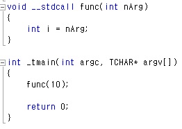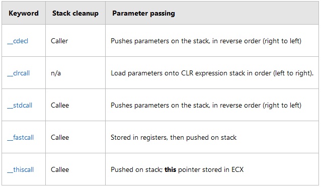 | __stdcall | parameter들을 역순으로(오른쪽에서 왼쪽 방향으로) 스택에 푸쉬한다. 스택 프레임 반환 작업은 피호출자(Callee: 호출을 받은 함수)가 한다. |