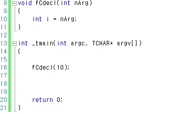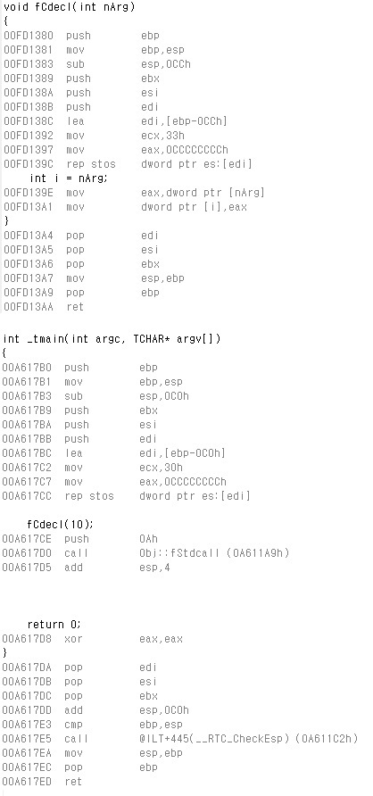 다음은 fCdecl 함수 내의 디스어셈블리 코드이다.