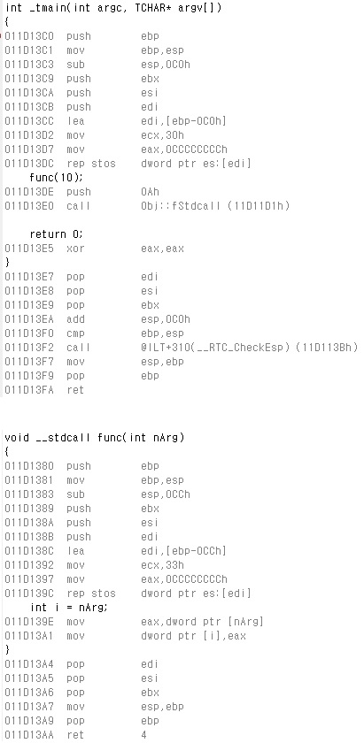 | __thiscall | this 포인터만 레지스터 ecx에 저장하고, 나머지는 스택에 푸쉬한다. 스택 프레임 반환 작업은 피호출자가 한다. |