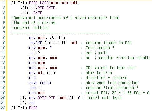 다음 예제 코드는 Irvine 교수의 어셈블리 언어 제 5판 9장에 실려 있는 Str_trim 프로시저 코드다. 문자열의 마지막 위치에서 처음 위치라는 역방향 인덱싱을 통해 선택된 문자(Trailing Character)를 모두 제거하는, 엄밀히 말하면 선택된 문자의 위치에 널 문자를 삽입함으로써 이를 제거하는 효과를 거두는 기능을 수행한다.