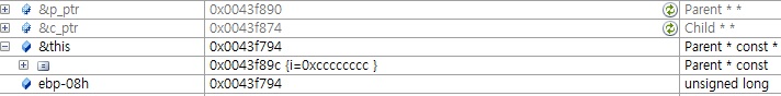 위의 스크린샷을 통해 this 포인터 변수의 주소 0x0043f794와 ebp-08h(0x0043f794)의 값이 일치함을 확인할 수 있다.